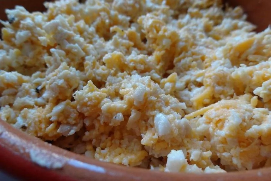 ШАГ 8 Осторожно смешать натертый на крупной терке сыр чеддер, измельченные белки и измельченное отварное куриное мясо.