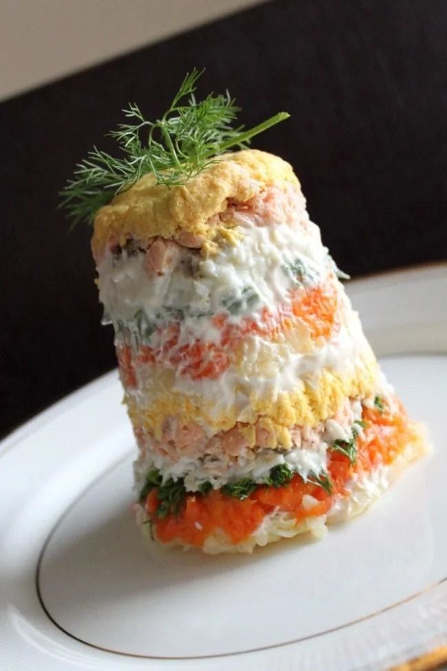 ШАГ 1 Отварите лосось в бульоне или подсоленной воде, разомните вилкой. Отварите яйца, очистите и отдельно измельчите белки и желтки. Отварите овощи, натрите их не мелкой терке. Оставьте несколько веточек укропа для украшения, остальную зелень мелко нарежьте. Майонез смешайте с солью и перцем.