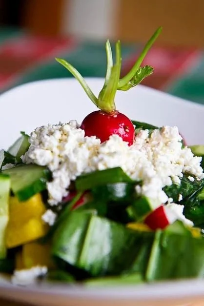 ШАГ 2 Как следует перемешав салат, переложите его на тарелки, выложив сверху зернистый творог. Полейте остатками заправки и подавайте к столу. При желании можно добавить зеленый лук или укроп, но черемша, на мой взгляд, вполне справится и без их помощи.