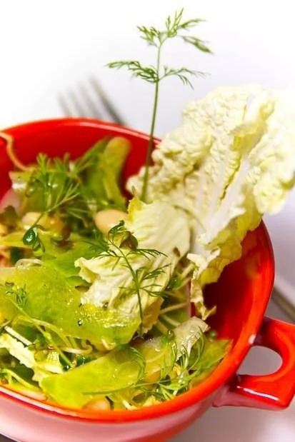 ШАГ 1 Нарежьте редьку — лучше всего овощечисткой, так у вас получатся тонкие, полупрозрачные «перья». Редис нарежьте потоньше обычным ножом, добавьте к ним фасоль, кресс и мелко порванные листья капусты.