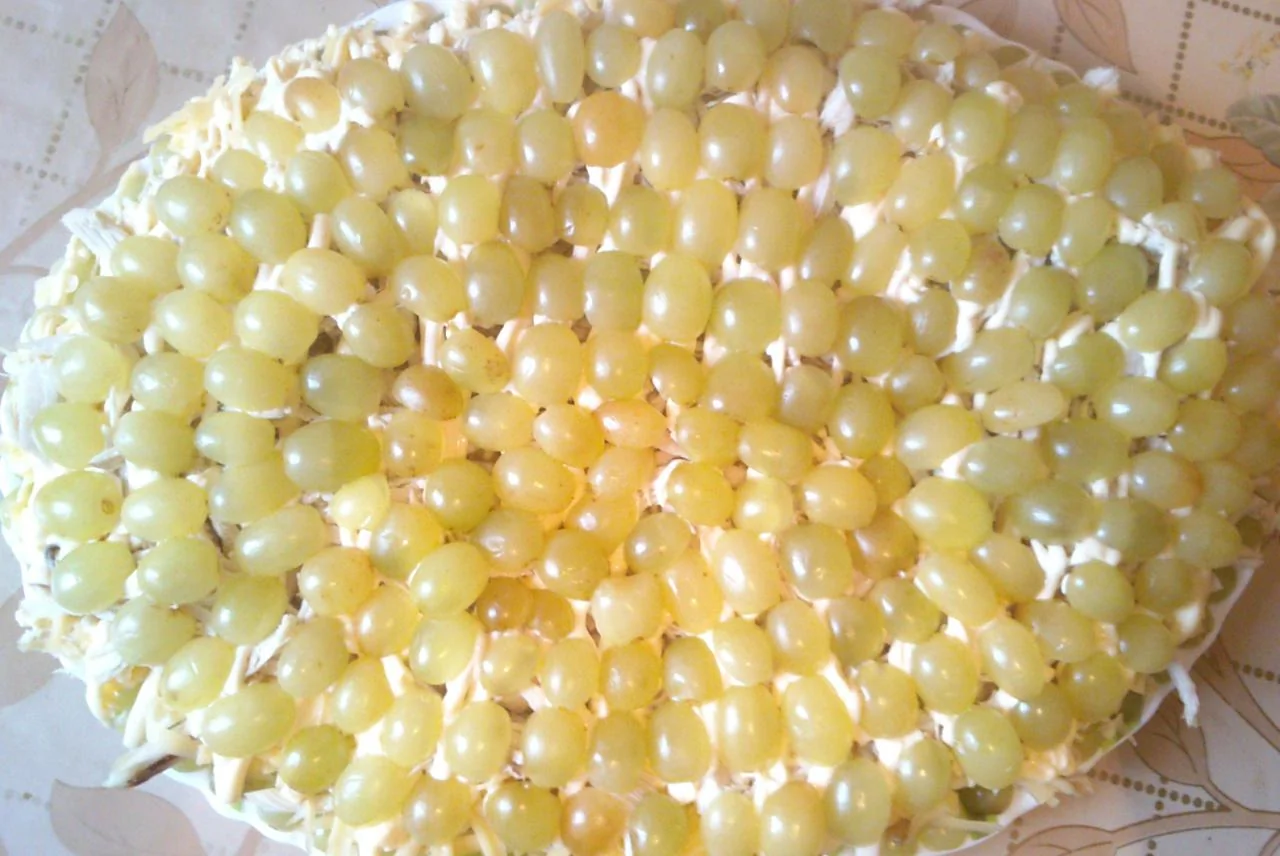 ШАГ 2 Выложить слоями на блюдо: виноград, курица, небольшой слой майонеза, сыр, небольшой слой майонеза, курица, небольшой слой майонеза, виноград. Толщину слоев можно изменять по вкусу.