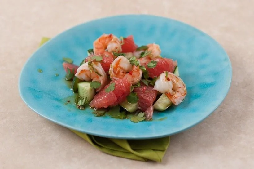ШАГ 7 На огурец выложите грейпфрут, креветки, полейте соусом, посыпьте крупнонарубленной кинзой и подавайте.