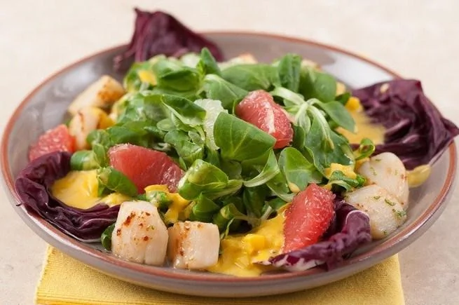 ШАГ 6 Выложите гребешки к салату, полейте сливочно-манговым соусом.