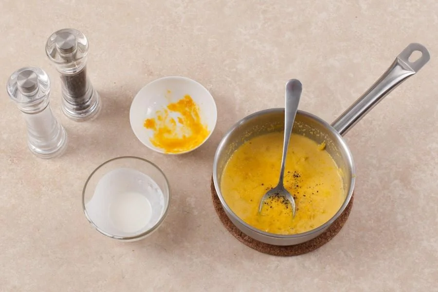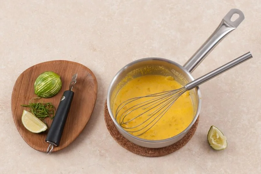 ШАГ 2 Снимите и отложите цедру 0,5 лайма; в конце приготовления выдавите в соус сок 1/4 лайма и взбейте венчиком; соус для гребешков готов.