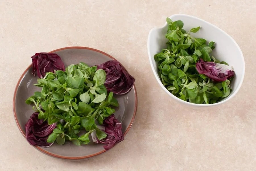 ШАГ 3 По краям тарелки выложите листья салата радиккьо, в центр — салат корн.