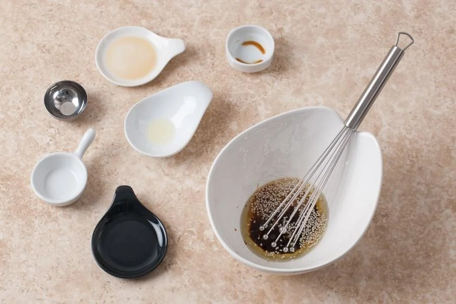 ШАГ 1 В 40 мл подсолнечного масла добавьте кунжутное масло, соевый соус, сахар, жареный кунжут и хондаши, перемешайте.