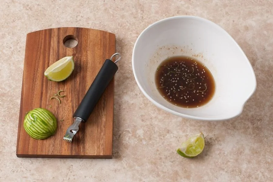 ШАГ 2 Снимите цедру с 0,5 лайма, выдавите сок из 1/4 лайма, смешайте все с соусом.
