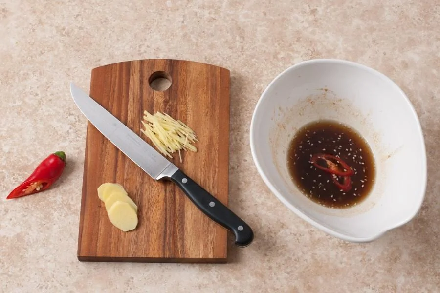 ШАГ 3 Очистите и нарежьте мелкой соломкой имбирь, отрежьте 2 тонких кусочка чили, добавьте в соус.