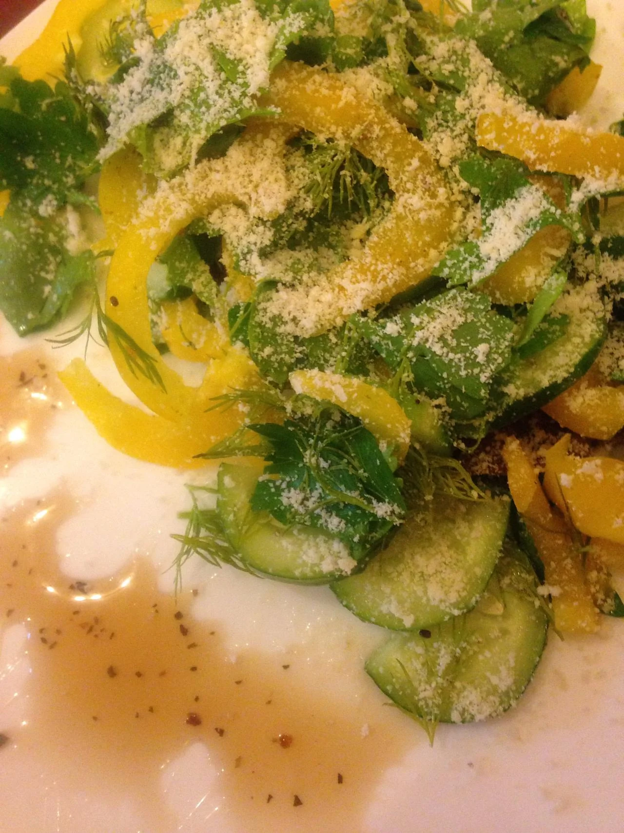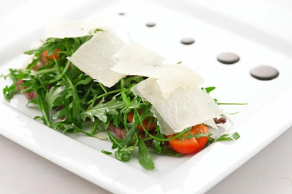 ШАГ 4 Выложить мясо по кругу на 4 порционные тарелки, сверху уложить горкой салат, на него натереть хлопьями пармезан (для этого удобно использовать специальную терку или нож для чистки овощей).