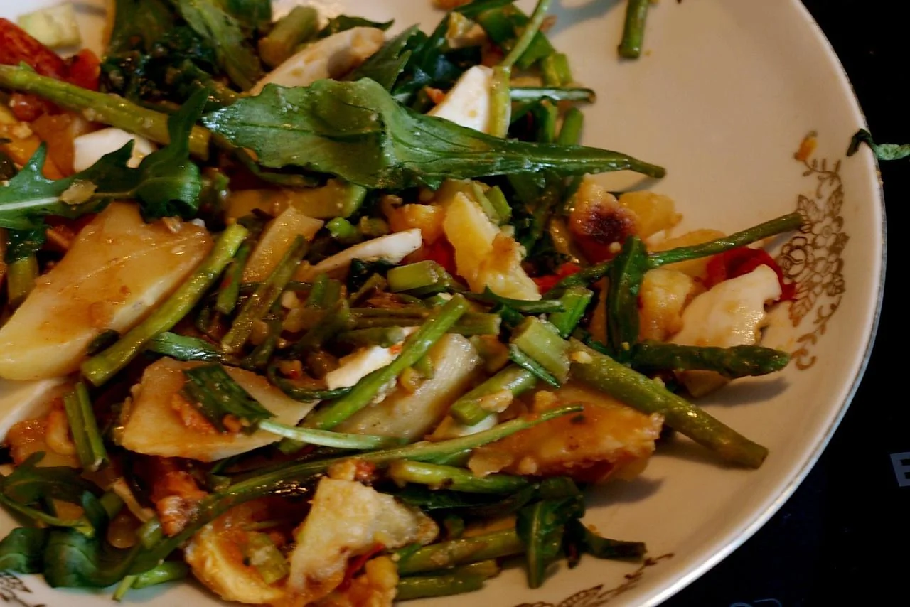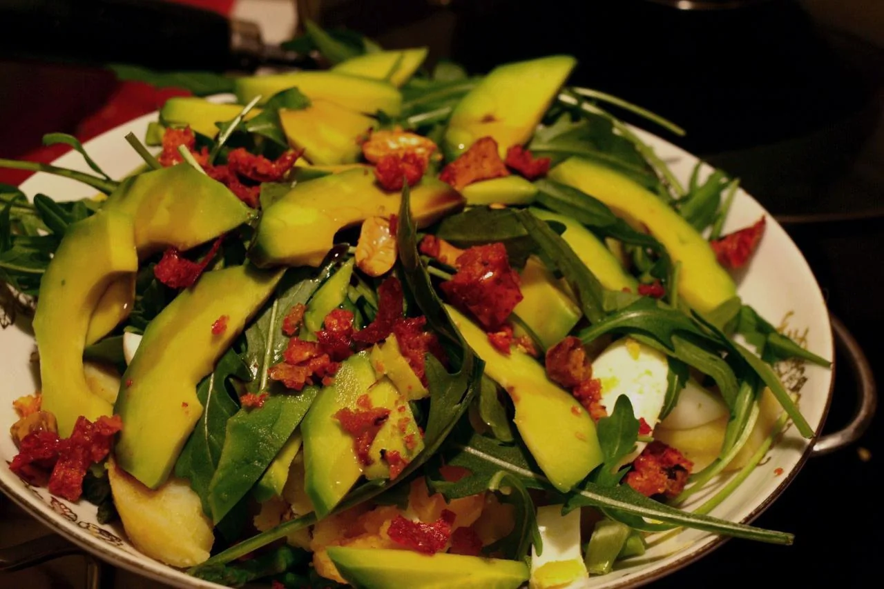 Салат из молодой спаржи с картофелем, авокадо и рукколой
