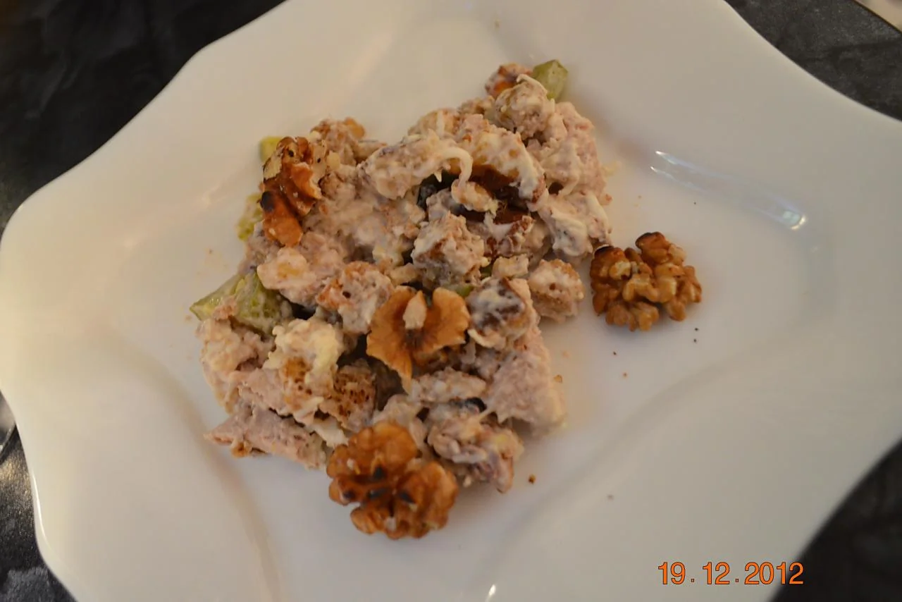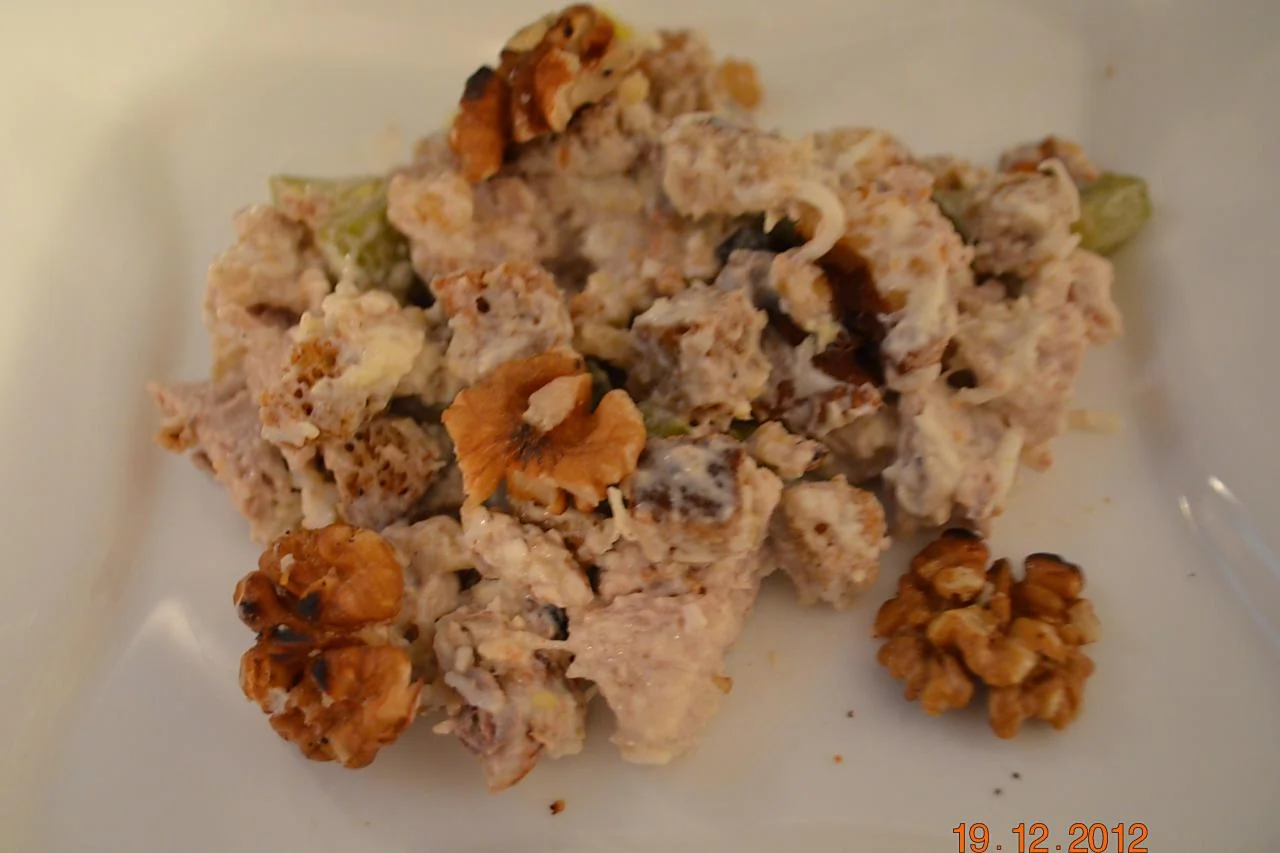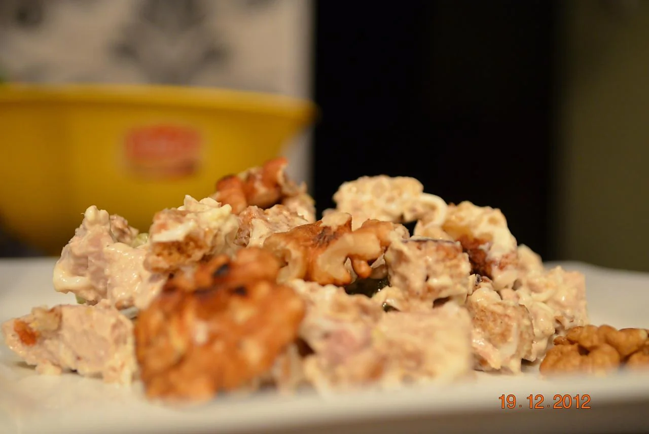 ШАГ 7 Картофель, яйцо, мясо, огурцы смешиваем, добавляем сухарики, измельченные орехи, хрен и зелень.