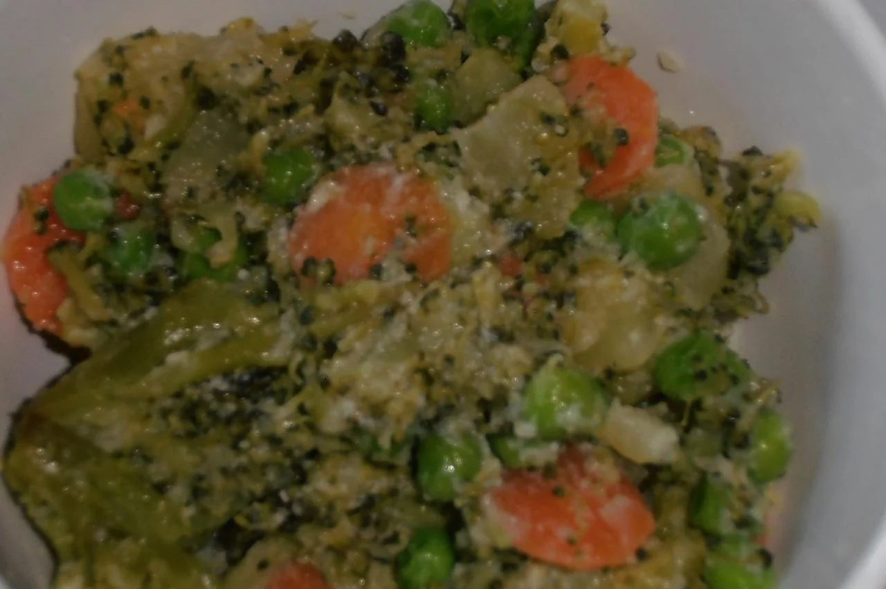 ШАГ 3 Обжарить на сковороде картофель и брокколи 2 минуты, добавить морковь и горошек без жидкости. Держать на среднем огне одну минуту, добавить йогурт и оставить обжариваться еще одну минуту.