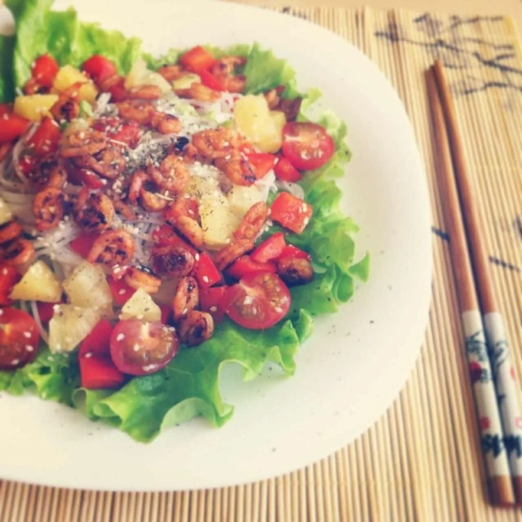 ШАГ 6 На тарелку выкладываем листья салата, сверху на каждом листике размещаем рисовую лапшу, перец, креветки и нарезанные кусочки ананасов.