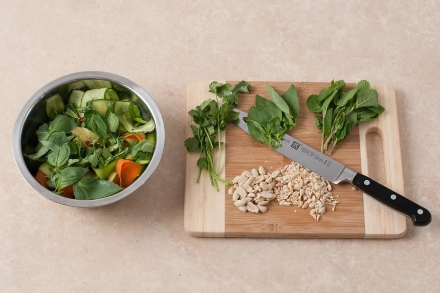 ШАГ 6 Нарвите листья базилика, отделите листья кинзы и мяты; нарубите арахис в крупную крошку; базилик и мяту добавьте к овощам и перемешайте.