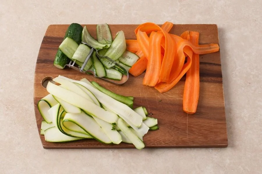 ШАГ 1 Очистите морковь; нарежьте морковь и огурец вдоль тонкими пластинами; цукини нарежьте тонкими пластинами до семян (семена не нарезайте).