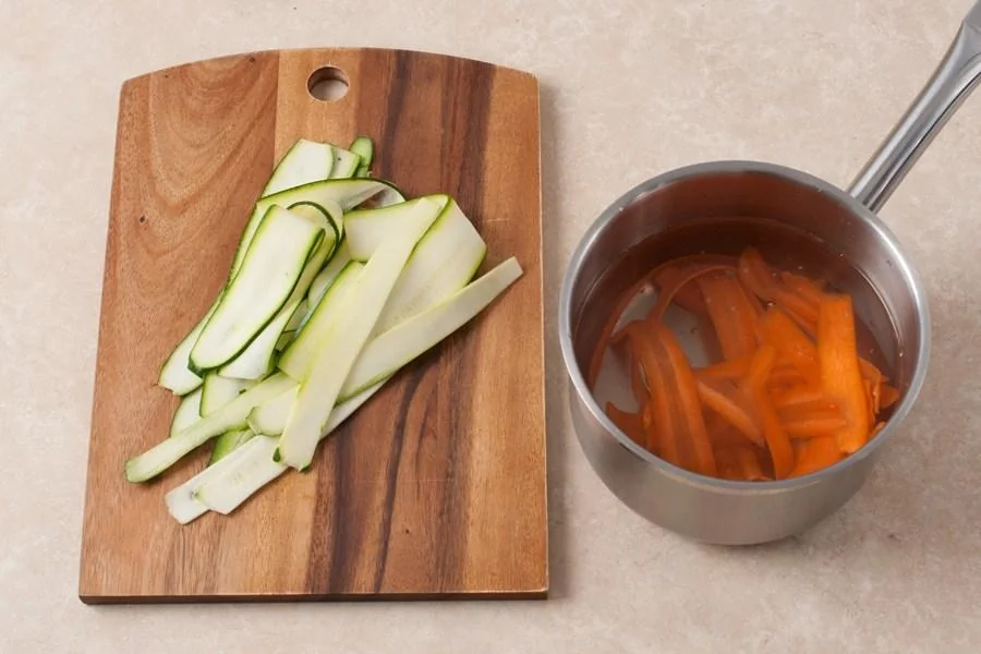 ШАГ 2 Вскипятите 1 л воды, закиньте морковь, бланшируйте 30 секунд, добавьте цукини и бланшируйте еще 30 секунд, откиньте овощи на дуршлаг и промойте холодной водой.