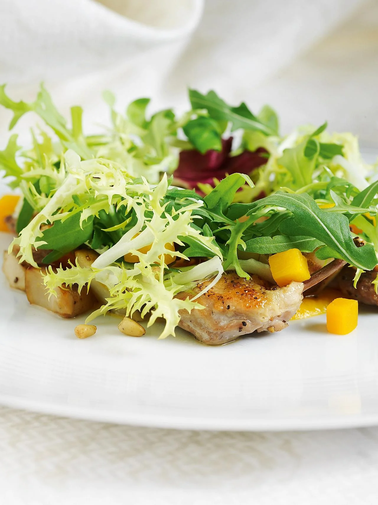 ШАГ 4 Выложить на тарелки тыквенное пюре, вокруг него — грибы и кусочки перепелки, посыпать кедровыми орешками (их тоже можно поджарить). Сверху добавить салатную смесь (руккола, радиккьо, корн, фризе).