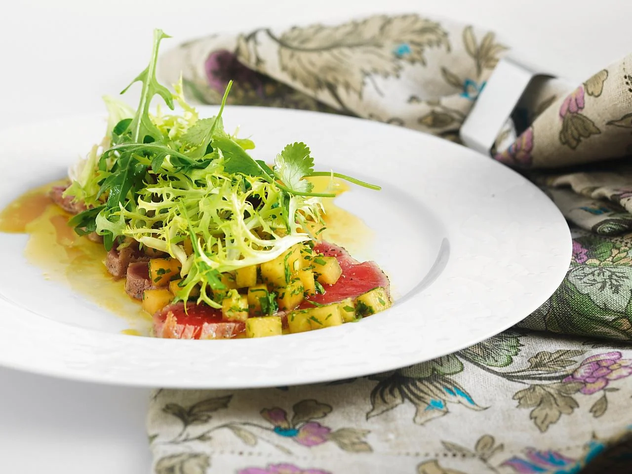 ШАГ 5 Разложить ломтики тунца по тарелкам. Полить соусом. Добавить кубики дыни. Завершить композицию салатной смесью (руккола, радиккьо, корн, фризе). Если хочется — посолить и поперчить.