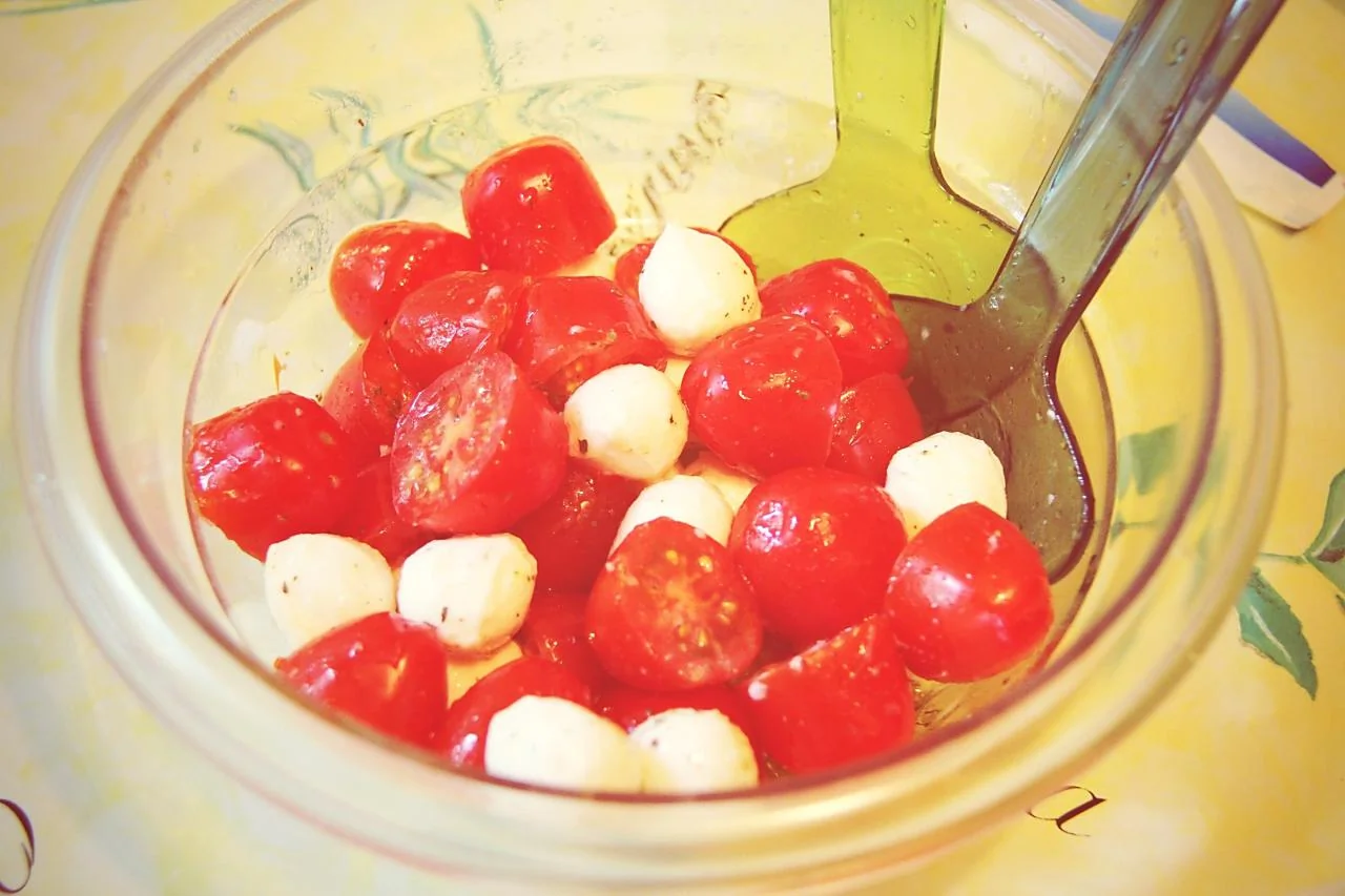 ШАГ 1 Вымыть помидоры, вынуть фету из рассола. Помидоры и фету нарезать одинаковыми по размеру небольшими кубиками (2x2 см). Переложить в салатник. Посыпать приправой. Полить оливковым маслом. Перемешать.