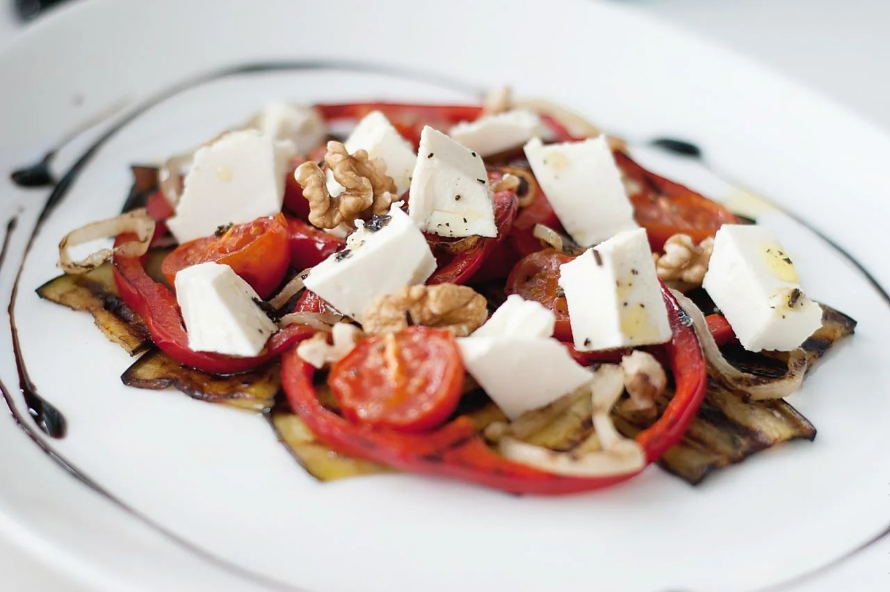Теплый салат из баклажанов и болгарского перца с фетой