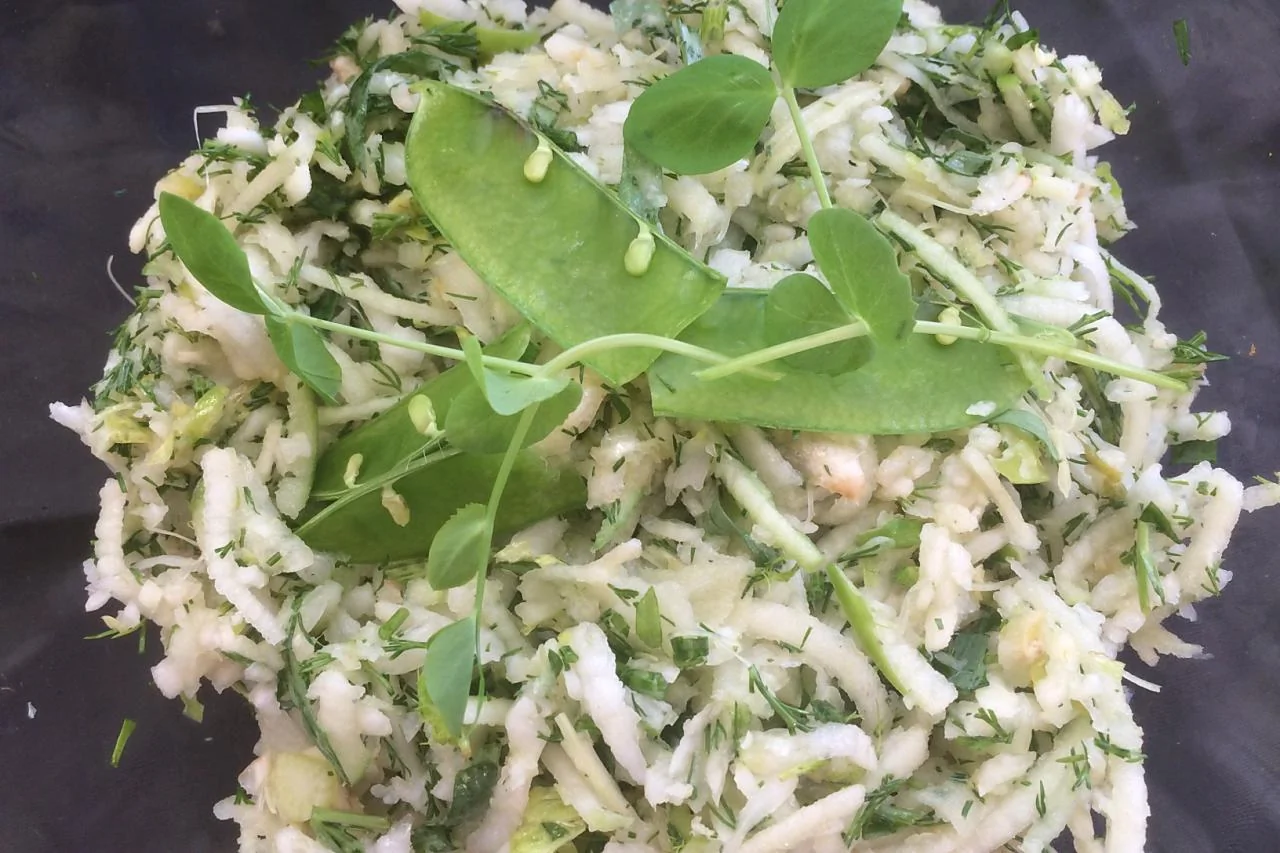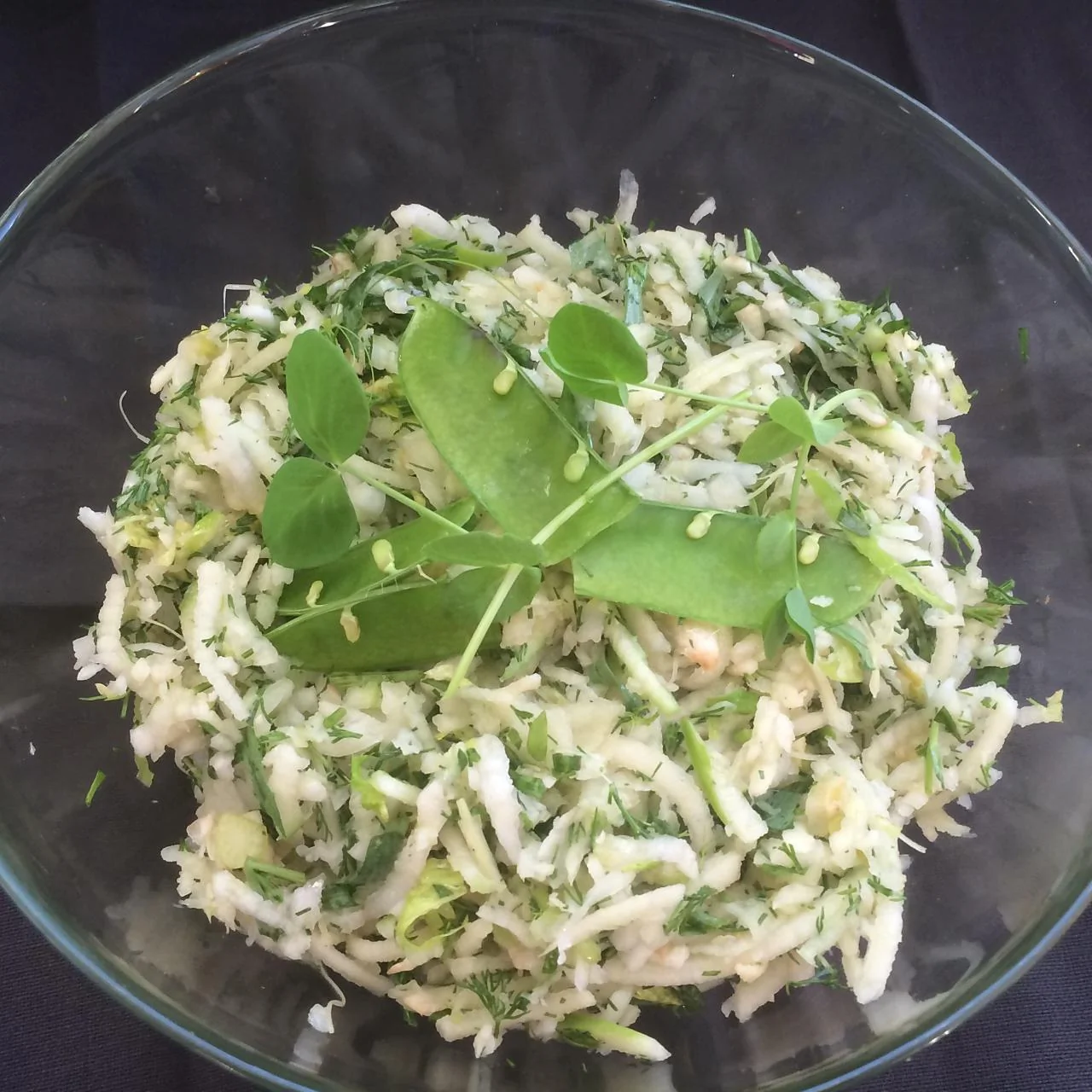 Оливковое масло extra virgin Яблочный уксус Эстрагон Лимонный сок Сахар Стебель сельдерея с листьями Фенхель Укроп Яблоко Соль Перец черный молотый Салаты Американская кухня Веганская еда