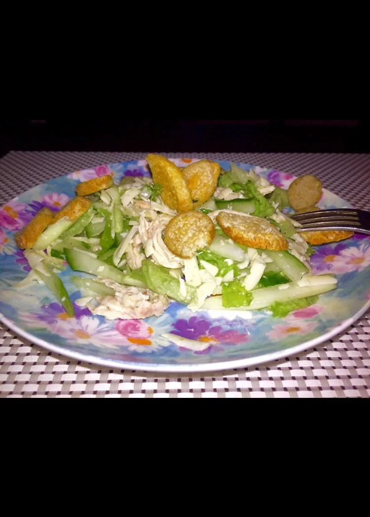 ШАГ 6 Смешать все ингредиенты, кроме сухариков. Полить заправкой, а сухари добавить перед подачей на стол.