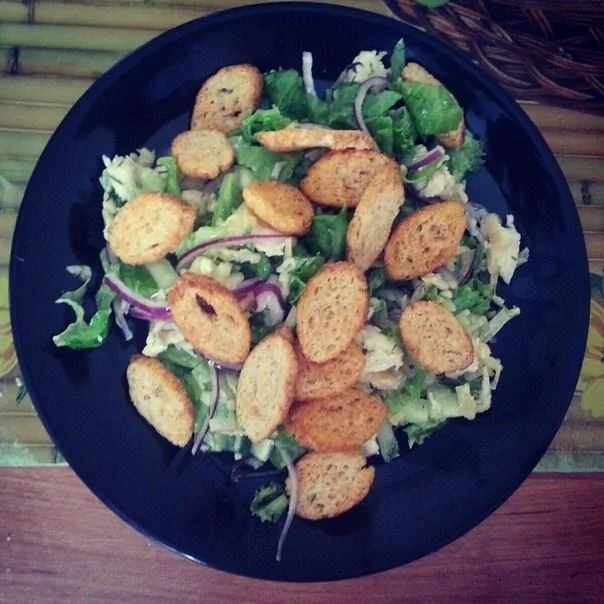 Ингредиенты для приготовления Хрустящий салат с курицей, красным луком и сухариками:
