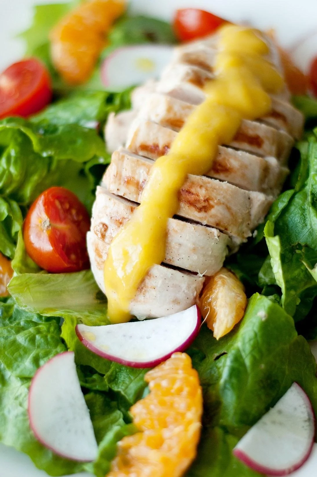ШАГ 3 Выложить в тарелку промытый и высушенный салат, нарезанные черри и редис, отчищенные от пленочек дольки мандарина, сбрызнуть оливковым маслом и посолить. Сверху выложить нарезанную ломтиками куриную грудку и полить манговой заправкой.