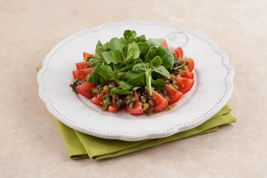ШАГ 7 Выложите помидоры на дно тарелки кругом, сверху на помидоры выложите заправку, в центр тарелки выложите салат корн и подавайте.