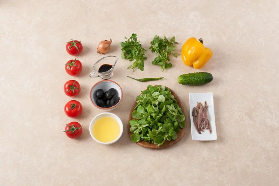 ШАГ 6 Смешайте болгарский и чили перцы, огурец, лук, маслины, анчоусы и зелень, добавьте 50 мл оливкового масла, уксус и тщательно перемешайте.