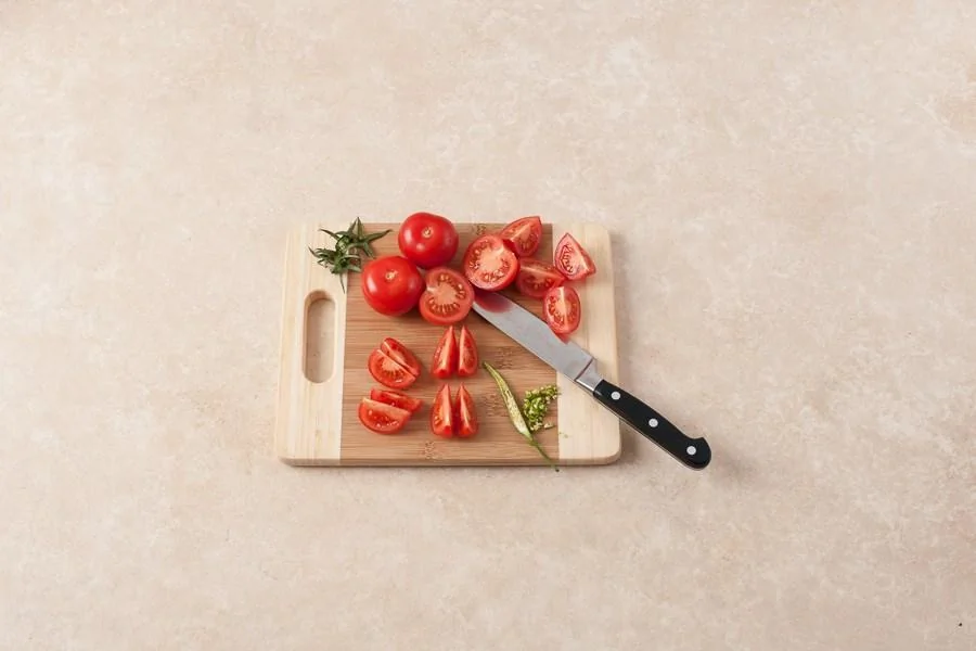 ШАГ 1 Нарежьте помидоры дольками на 8 частей; мелко нарубите 0,5 чили перца.
