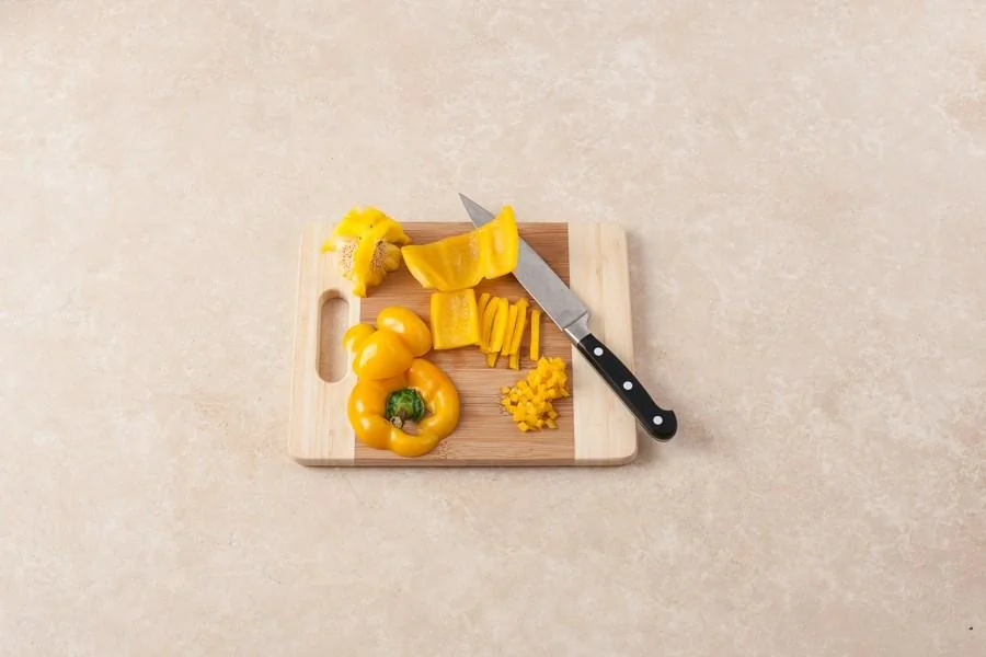 ШАГ 2 Срежьте шляпку и донышко болгарского перца, разрежьте его на 4 части, срежьте семена с перегородками, нарубите его мелким кубиком.