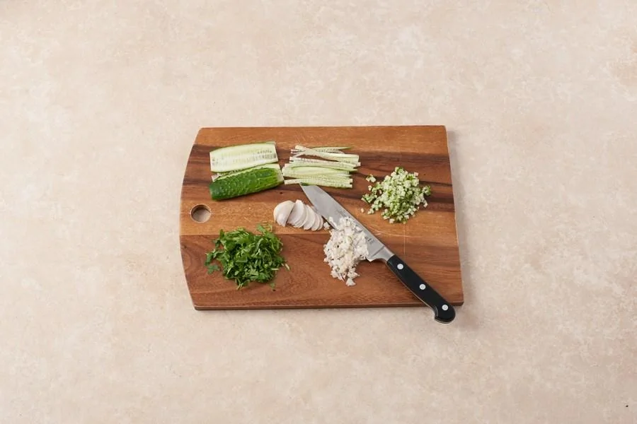 ШАГ 3 Огурец и лук-шалот нарежьте мелким кубиком, зелень — мелко.
