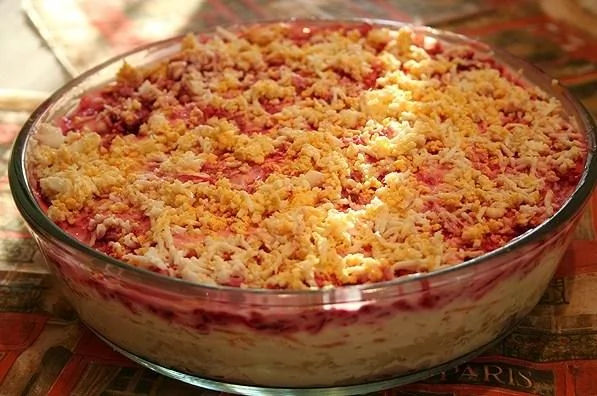 ШАГ 6 Салат выложить на плоское блюдо слоями: картофель (с майонезом смешанный); селедка + майонез; лук; морковь + майонез; яблоко + майонез; свекла.