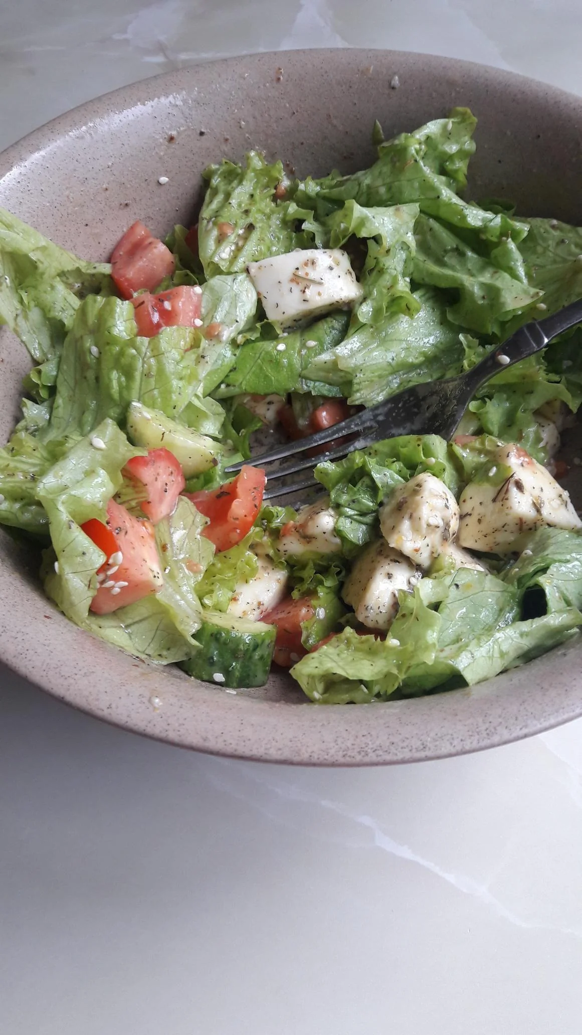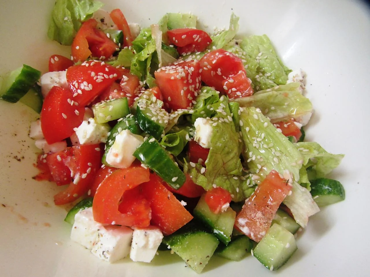 Овощной салат с моцареллой, кунжутом и пикатной заправкой