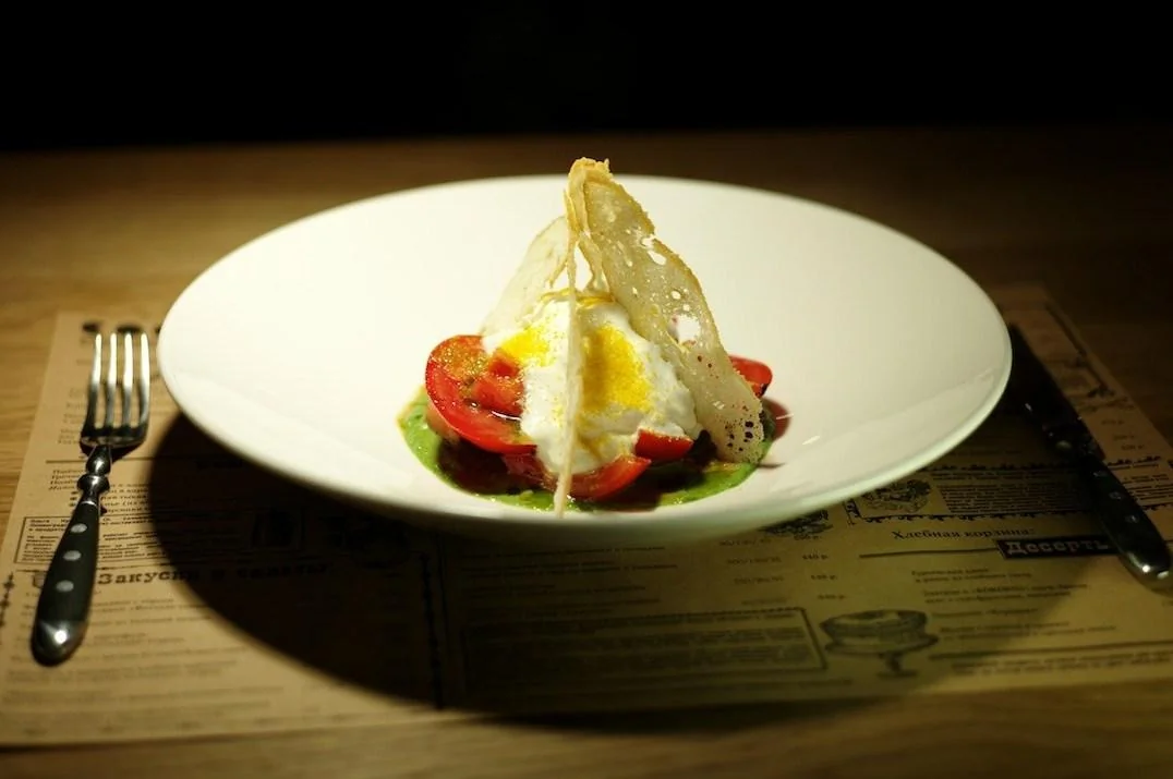 ШАГ 4 В центр тарелки налить песто, на него выложить помидорный салат, сверху — сливочный мусс из сифона.