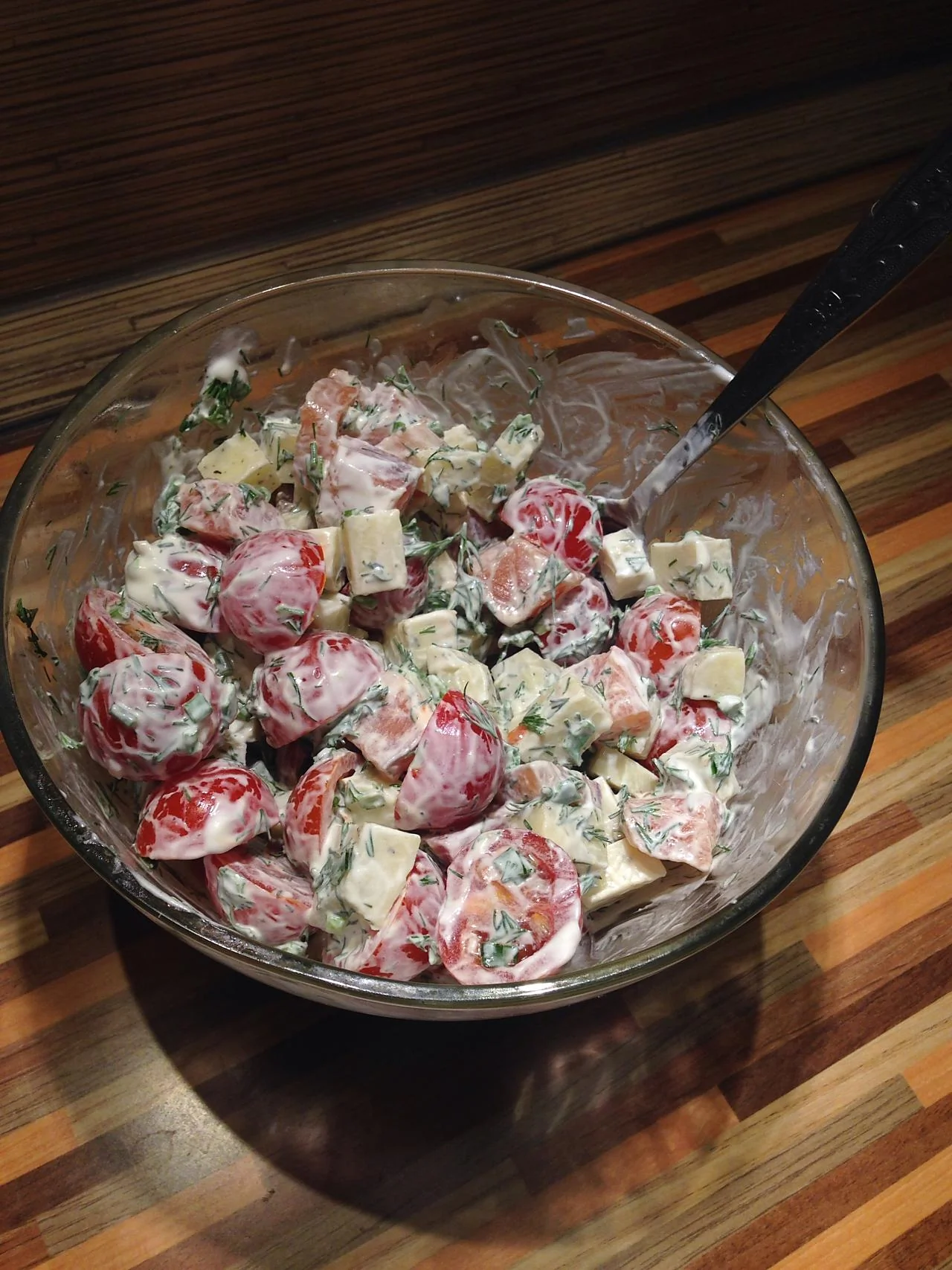Ингредиенты для приготовления Салат с семгой, помидором, сыром и зеленью: