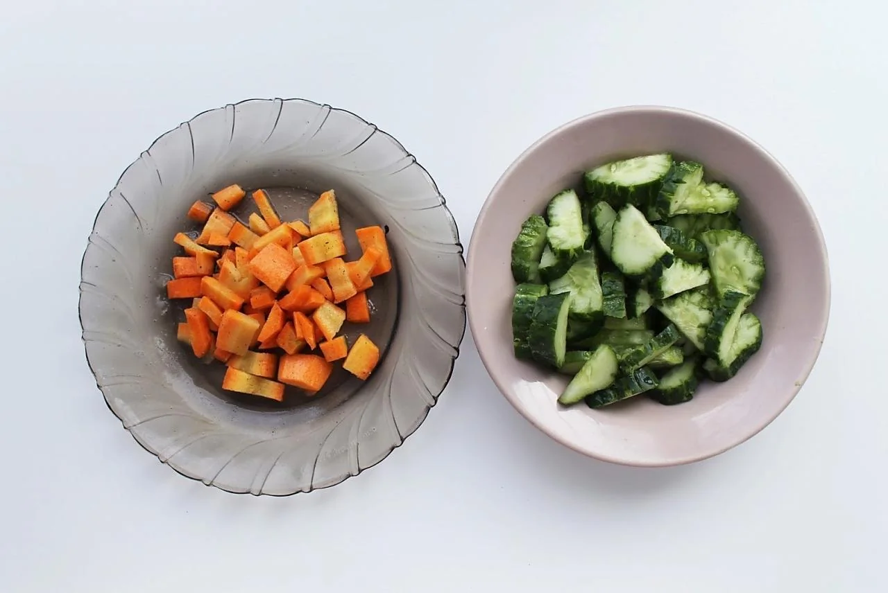 ШАГ 2 Морковь нарезать на прямоугольнички, полить соком лайма или лимона, посыпать солью и перцем. Огурец нарезать на полукруги.