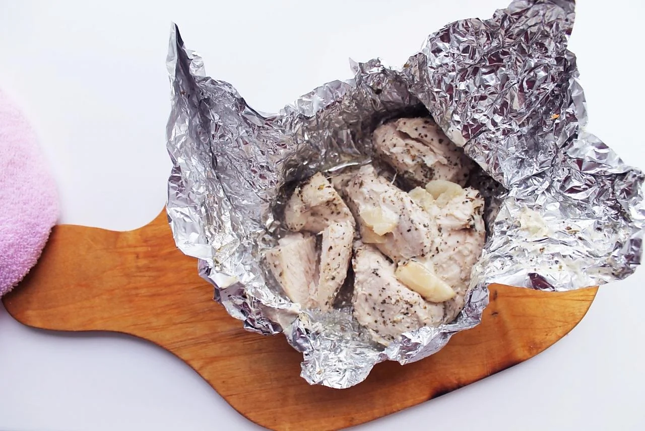 ШАГ 1 Курицу обвалять в специя (у меня — итальянские травы), положить чеснок, который использовали для заправки, завернуть в фольгу и запекать 30–40 минут при 200 градусах.