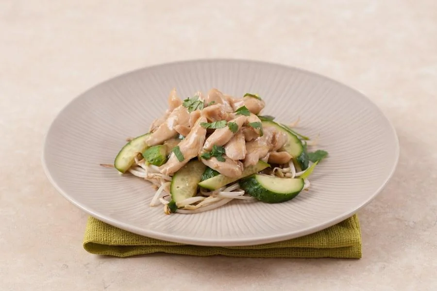 ШАГ 7 На ростки сои выложите огурец с луком, курицу, полейте соусом, посыпьте мелко нарубленной кинзой и подавайте.