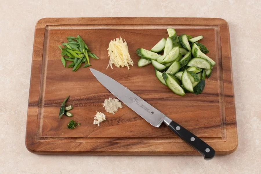ШАГ 1 Нарежьте имбирь тонкой соломкой, огурец — крупными дольками, лук — крупно, очистите, раздавите и мелко нарежьте чеснок, разотрите его до состояния пасты, отрежьте и мелконарубите 2 тонкие пластины чили перца.