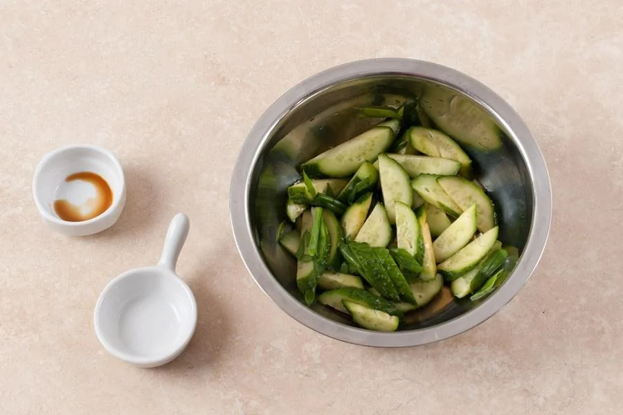 ШАГ 3 Смешайте лук и огурец, добавьте рисовый уксус и оставшийся соевый соус, перемешайте.