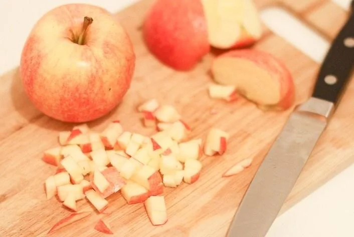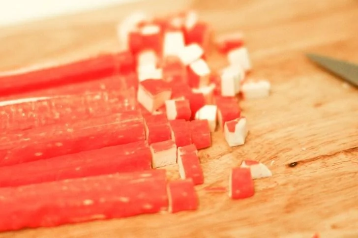 ШАГ 2 Нарезать яблоки, крабовое мясо (палочки) и яйца кубиками.