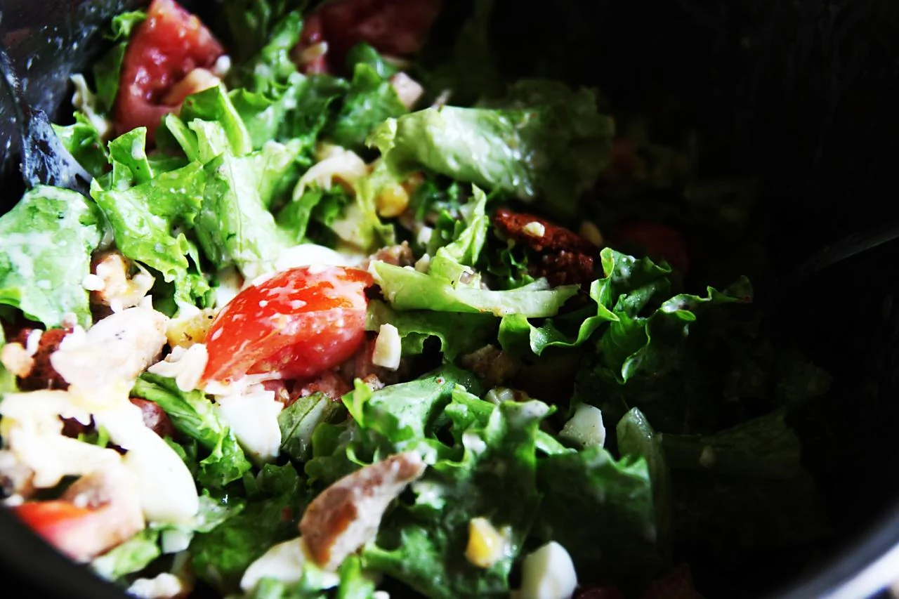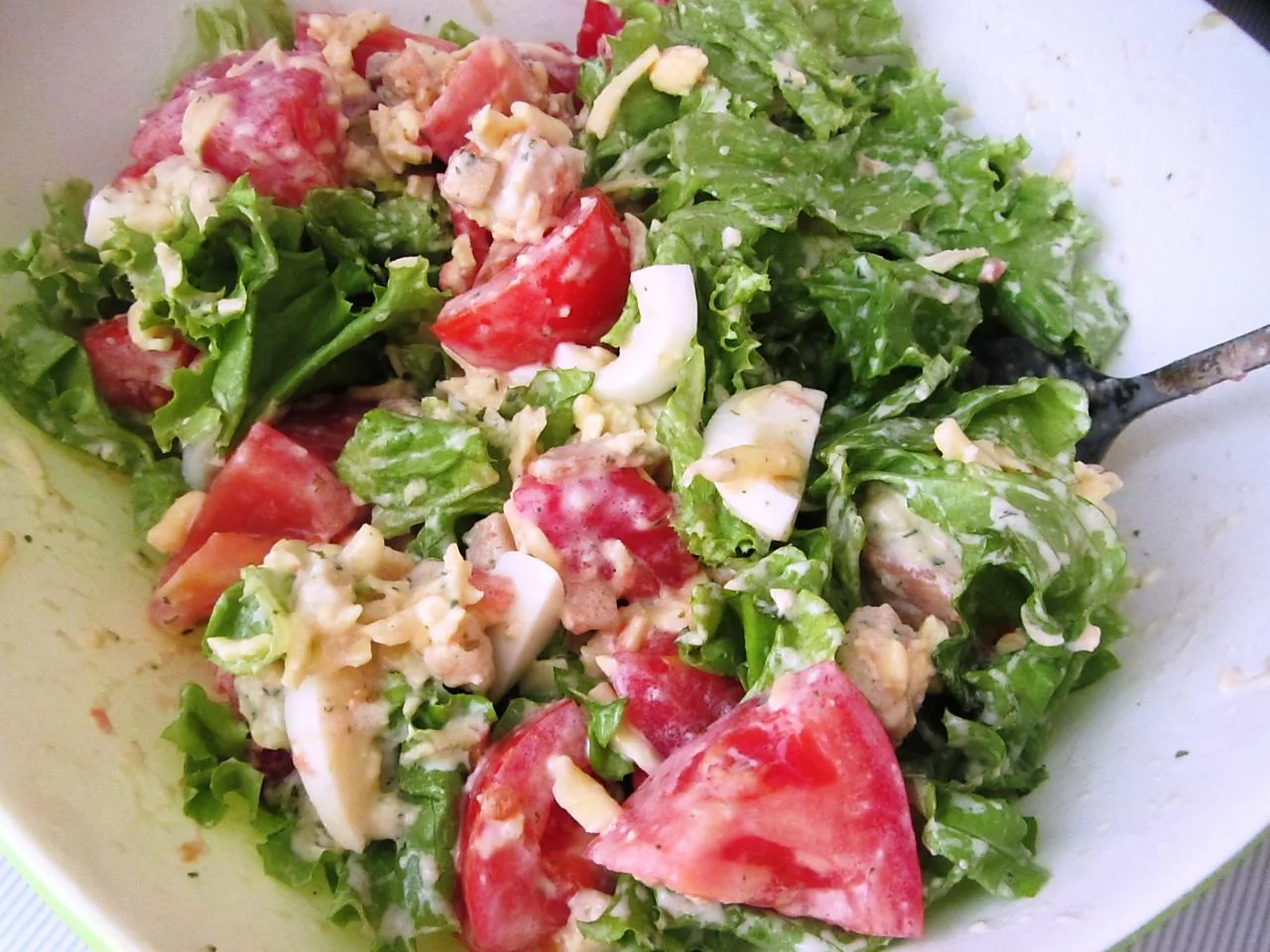 ШАГ 6 Все сложить в подходящую посуду, заправить соусом. Если курица при жарке посолена достаточно, обычно, досаливать сам салат не нужно.