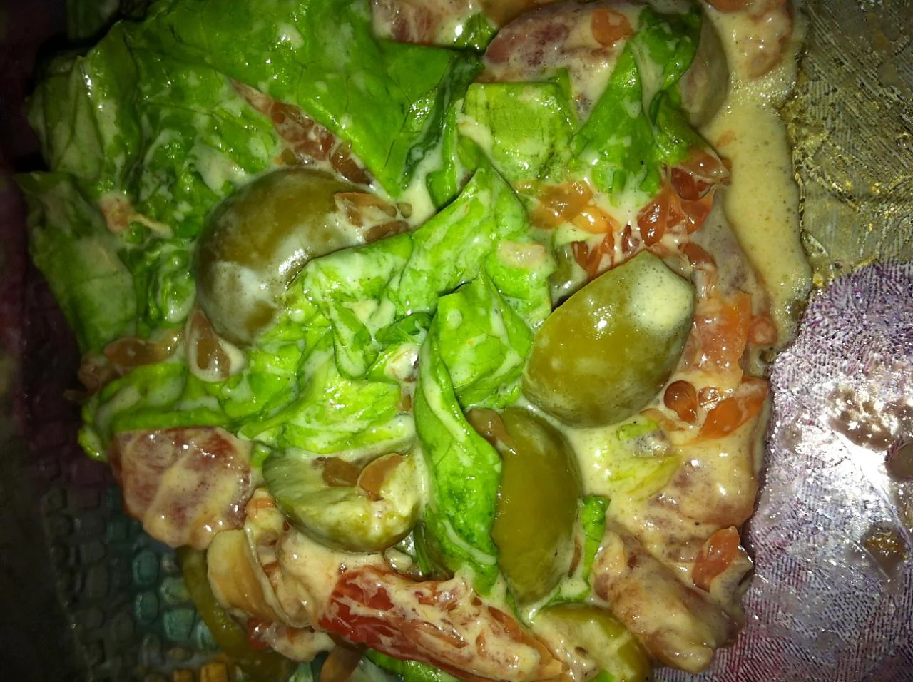 ШАГ 4 Смешайте салат, лук, семгу, грейфруты, сыр, оливки. Залейте соусом, посолите и поперчите. Дайте настояться минут 10.