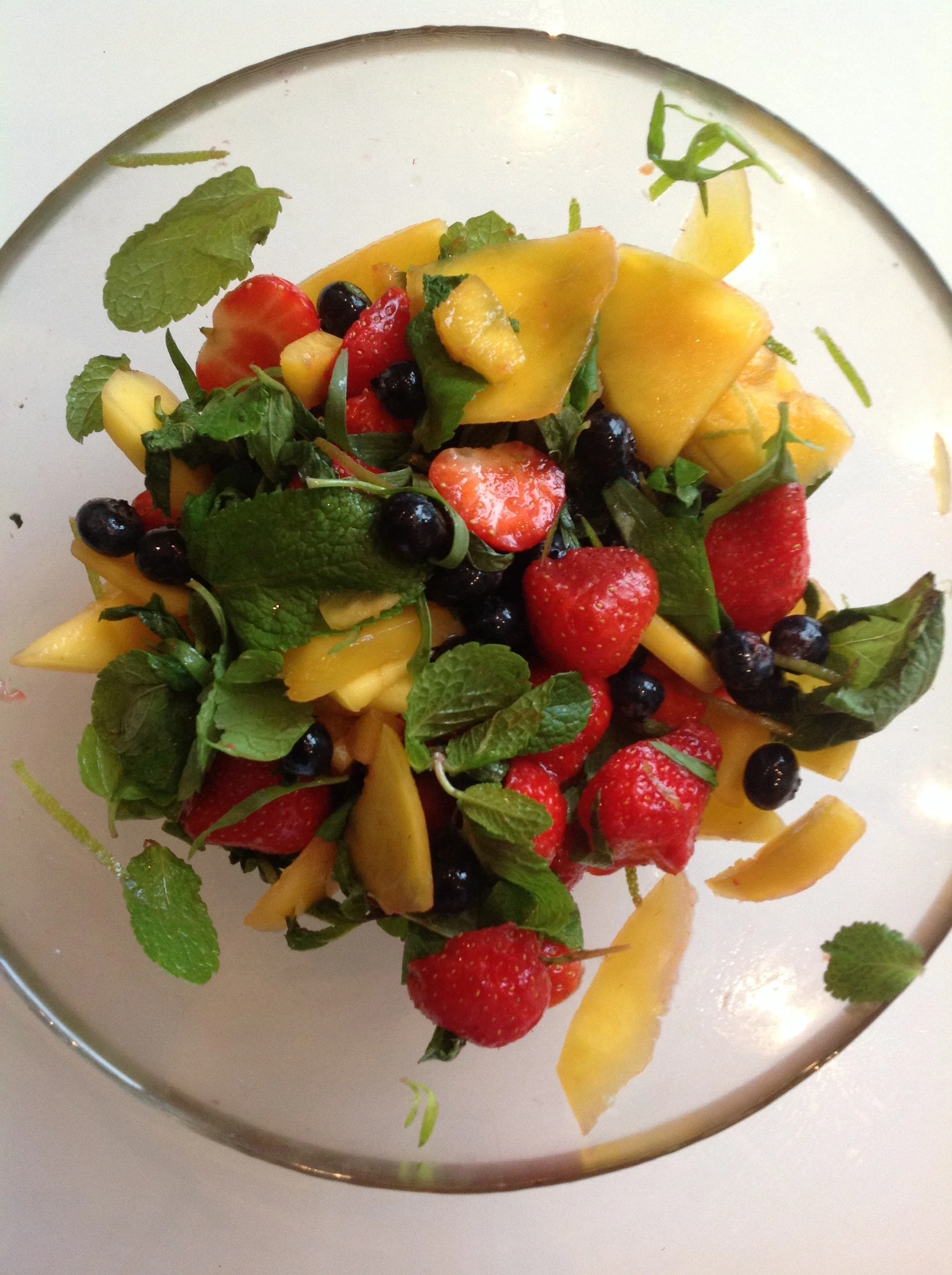 ШАГ 6 Смешайте манго, клубнику, листья мяты, голубику в салатнике и заправьте соком лайма.