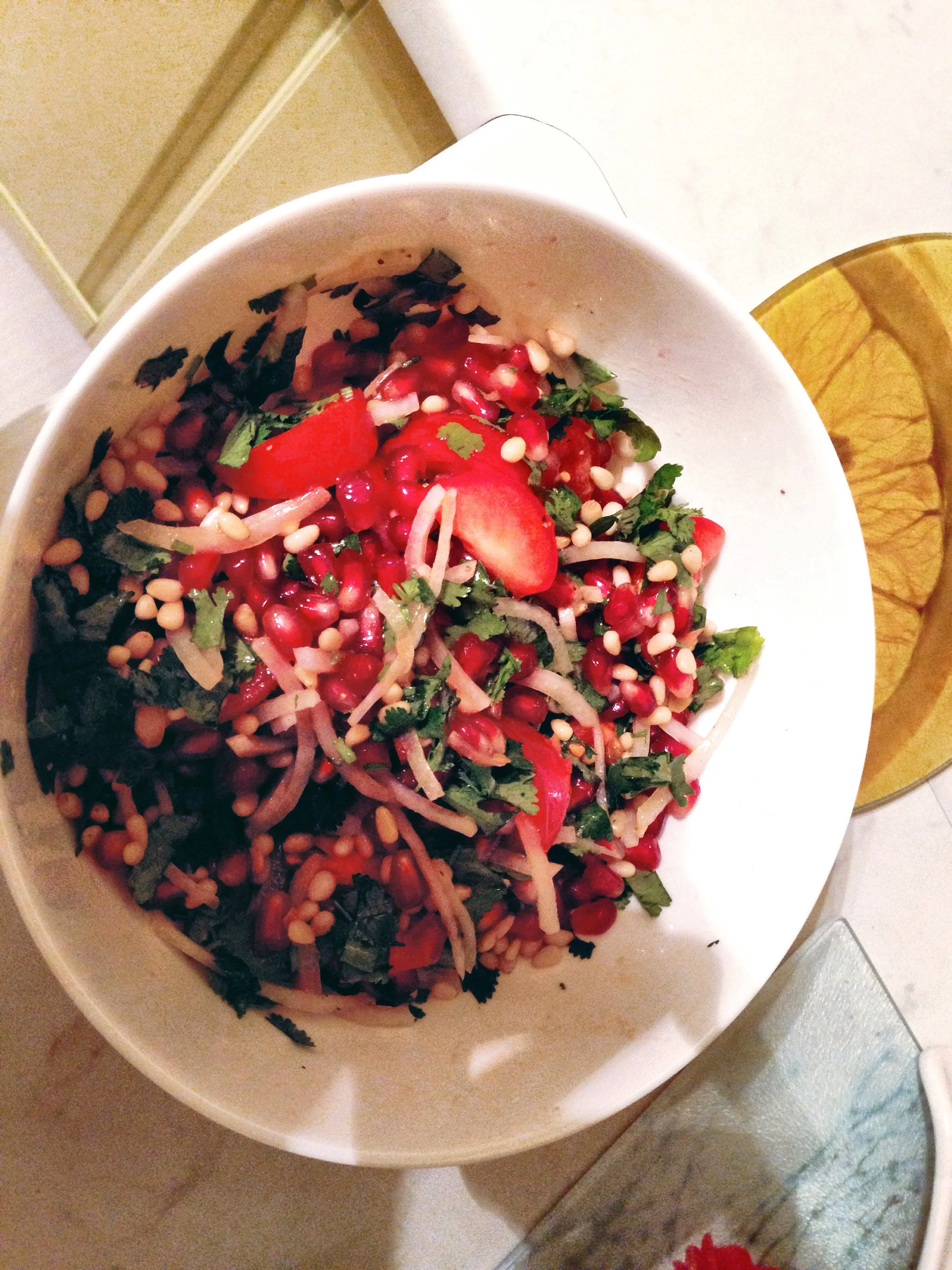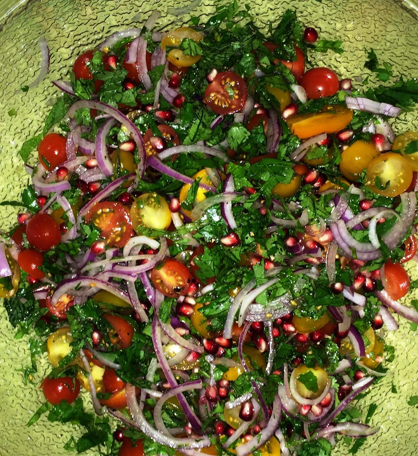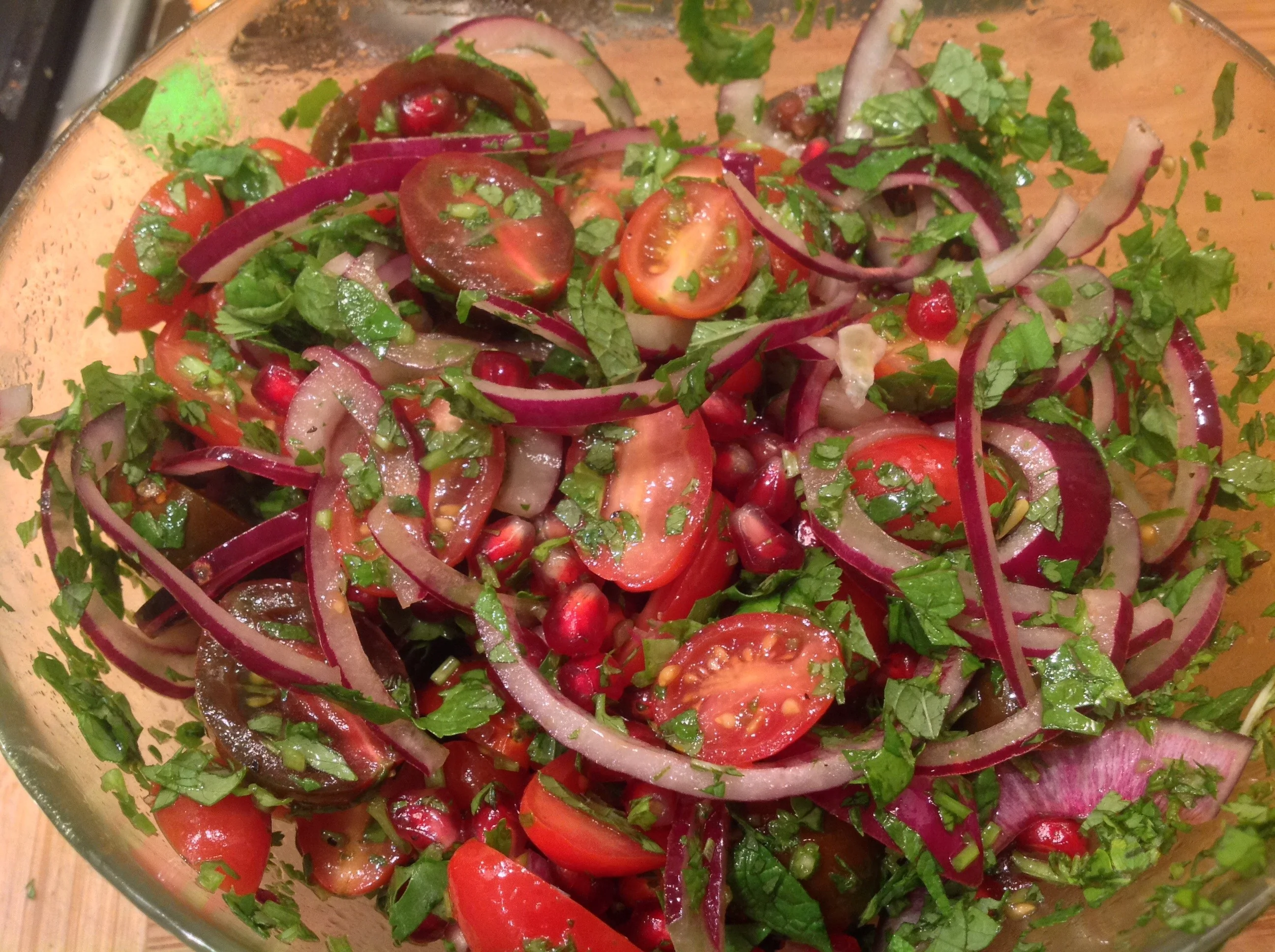 ШАГ 5 Смешайте помидоры, лук, зерна граната и травы в прозрачном салатнике.