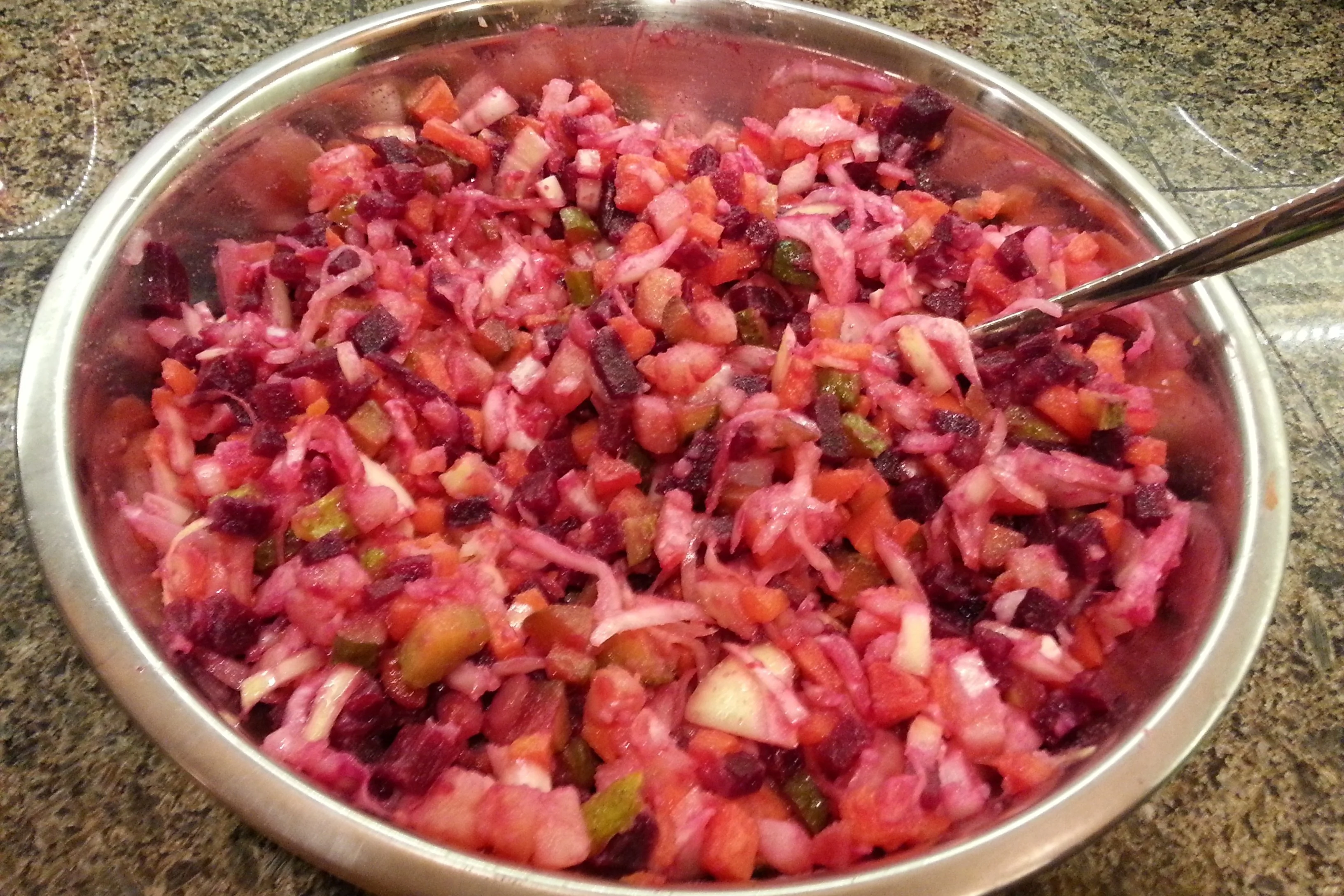 ШАГ 5 Смешать картофель, морковь, огурцы, лук, капусту, свеклу.