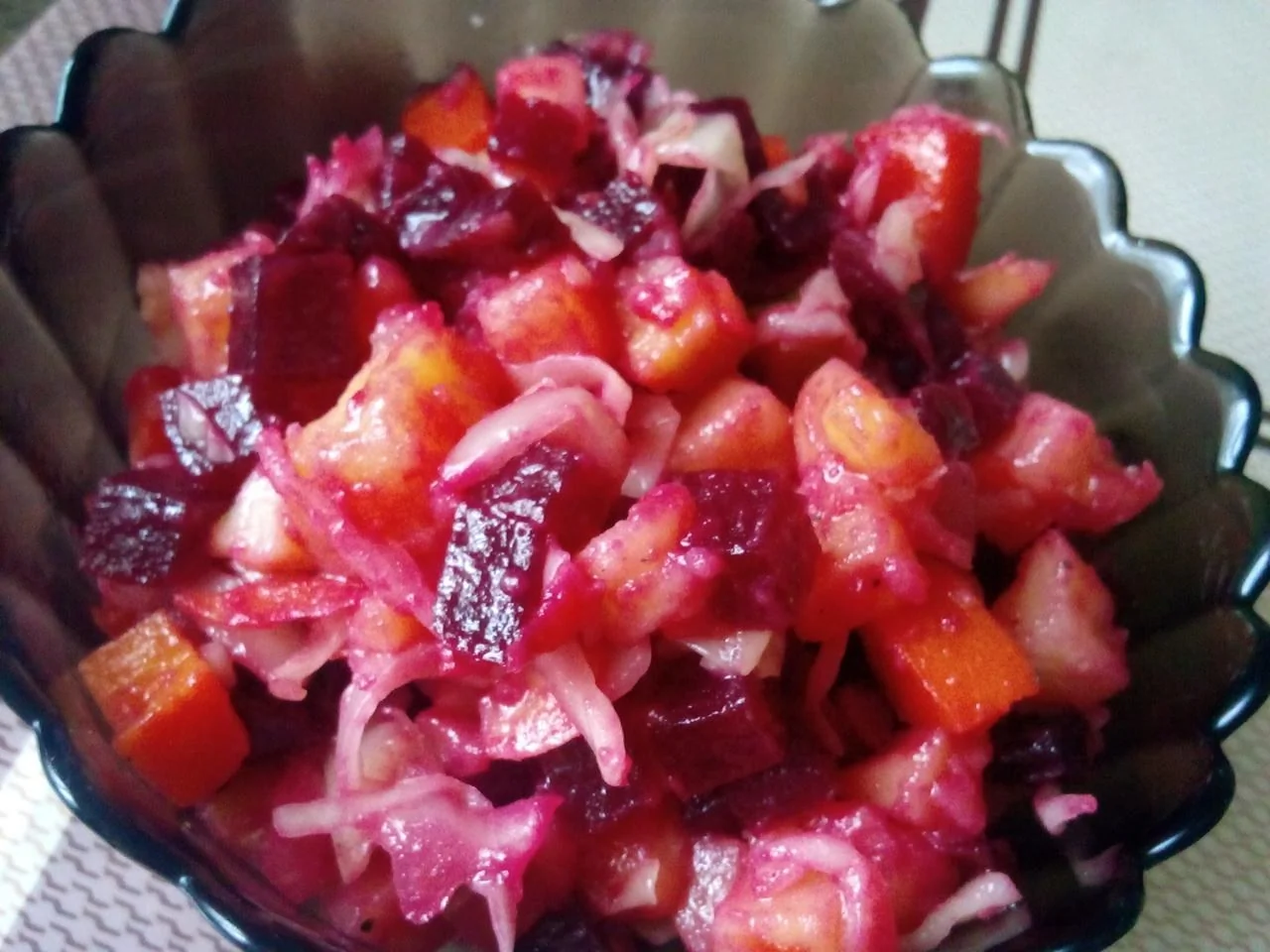 ШАГ 1 Свеклу, картофель и морковь отварить до готовности, остудить, почистить и нарезать кубиками.