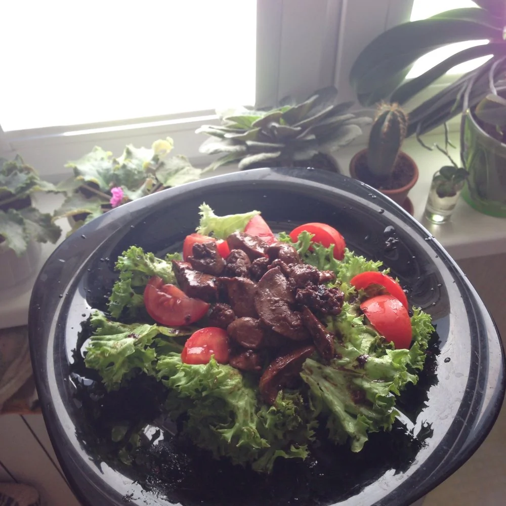 ШАГ 5 В это время промытый и обсушенный салат выложить на блюдо (крупные листья порвать). Сверху зеленой «подушки» выложить обжаренную теплую печень, полить оставшейся от нее подливой. Помытые черри слегка раздавить, полить этим соком салат и выложить их туда же.